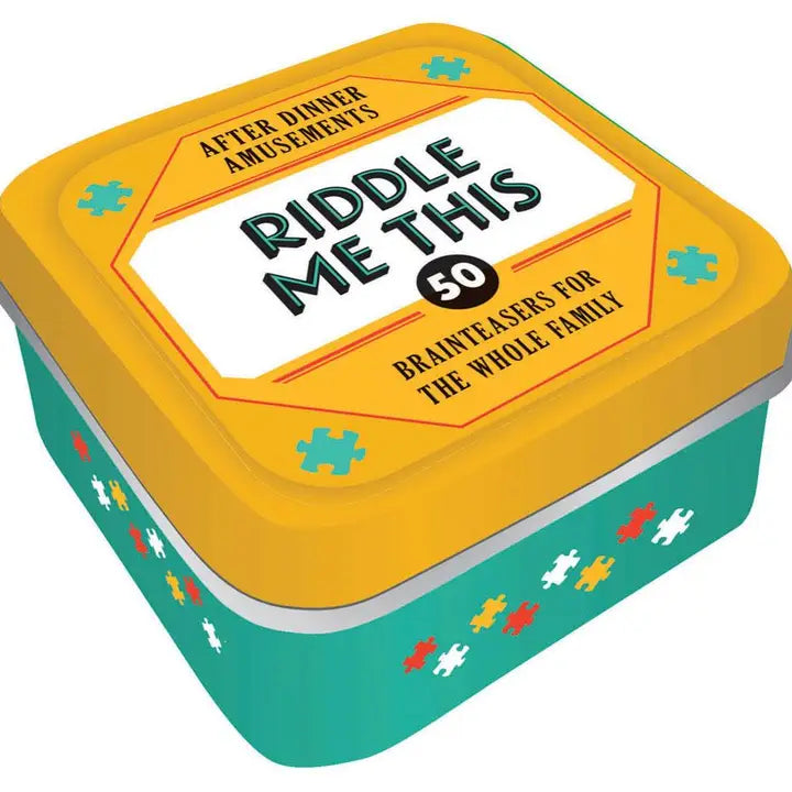 What's the perfect boredom buster for any occasion, be it a cozy night at home or a long family road trip? A riddle! And this irresistible little tin contains 50 of them. • tin box with lift-off lid: 2-1/4" x 2-1/4" x 1-1/4" • 51 cards: 2" x 2" • full-color throughout • for 2 or more players