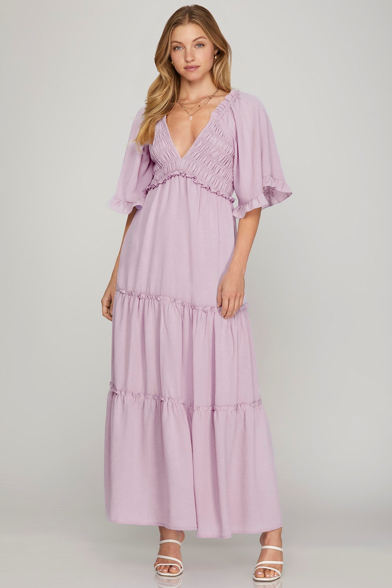 Upgrade your wardrobe with our Bell Sleeve Smocked Tiered Maxi Dress. This dress features elegant bell sleeves and a smocked bodice, giving you a flattering silhouette. Enjoy the comfort of a tiered maxi dress while still looking stylish. Perfect for any occasion.
