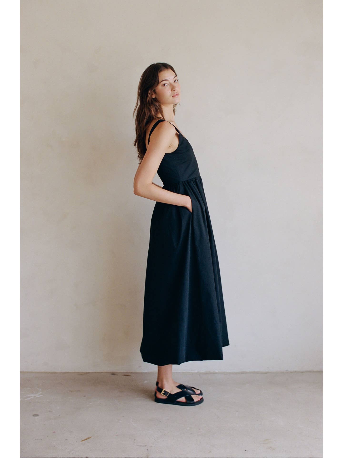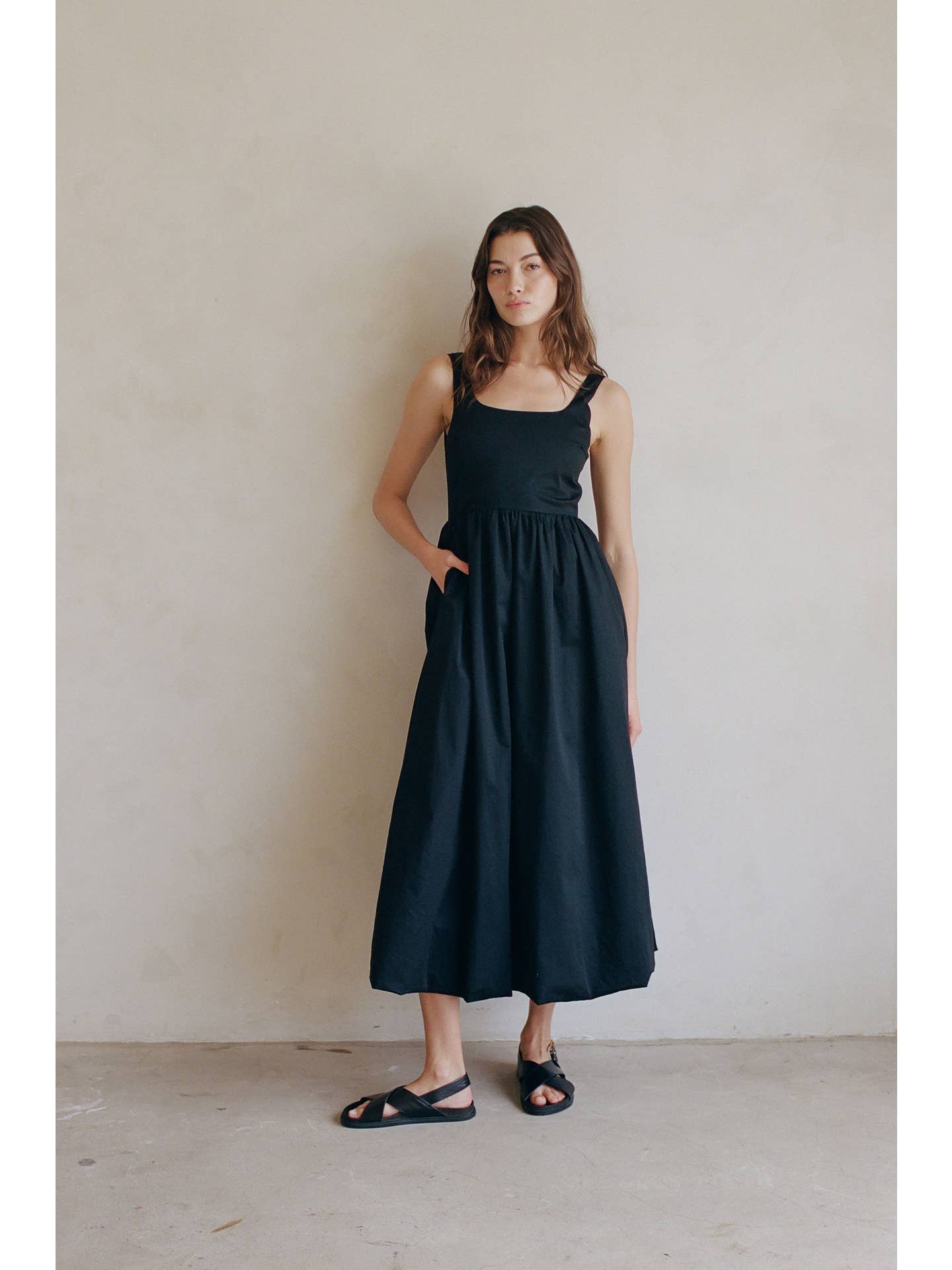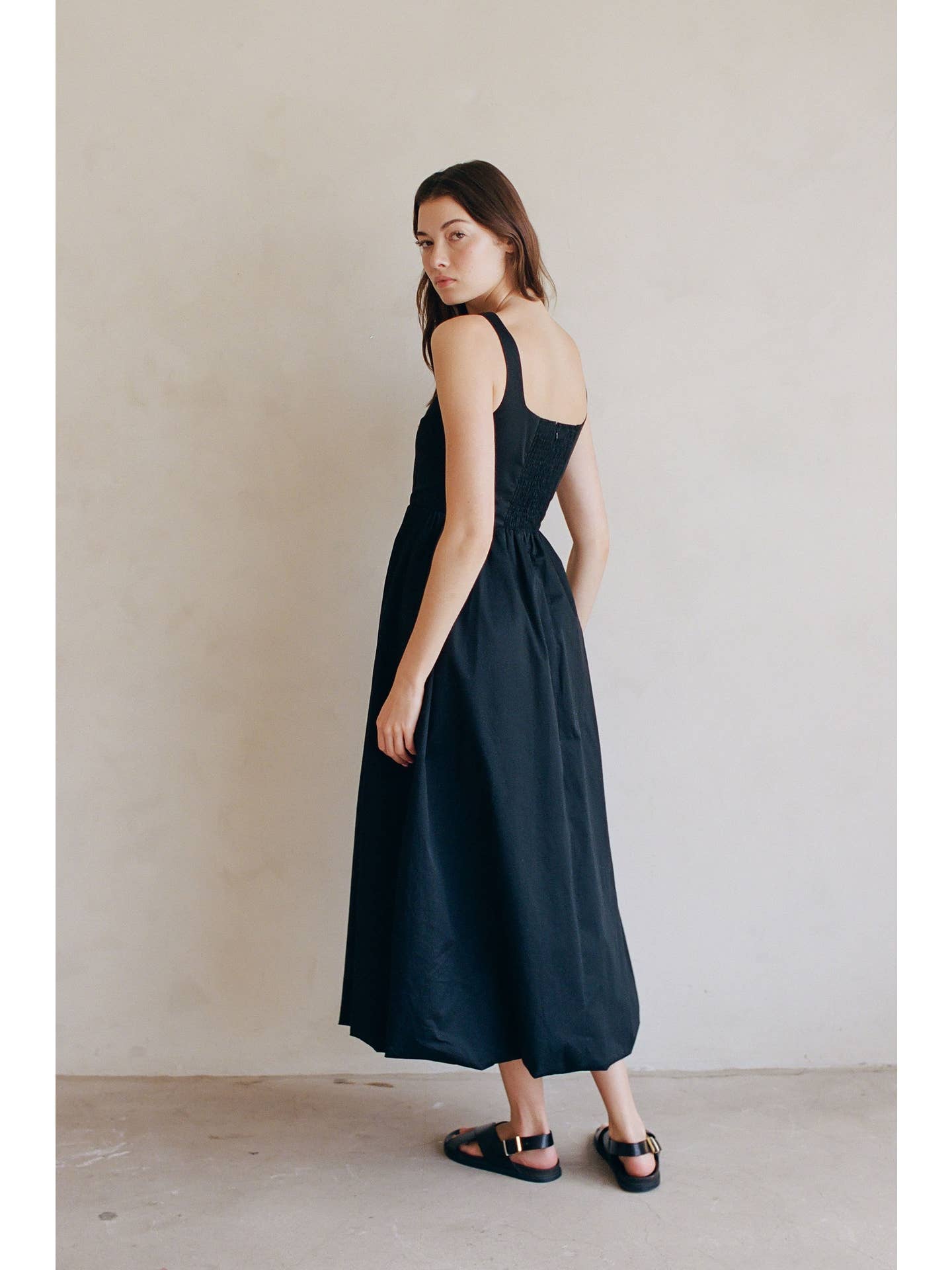 Woven Cotton Spandex Scoop Neck Sleeveless Bubble Hem Maxi Dress With Rayon Lining And Back Smocking, Back Zipper, Side Pocket