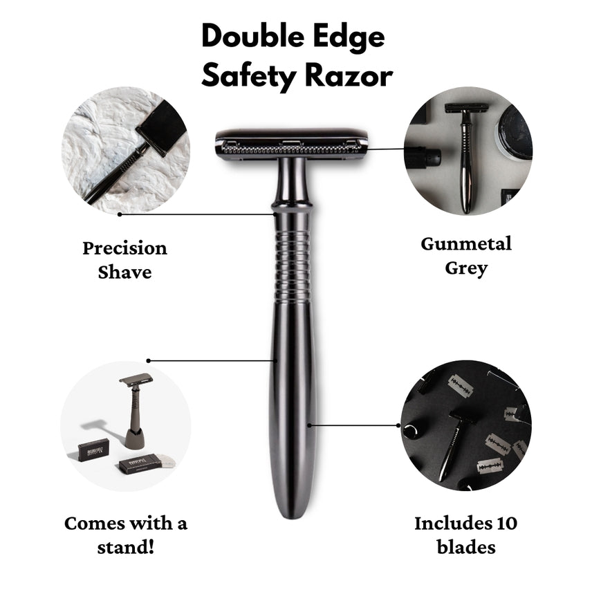 Elevate your shaving routine with a sharp, double edge safety razor. Single blade for optimal shaving and less irritation, this safety razor lasts forever and shaves like none other! Eco friendly (over 2 billion disposable razors are thrown away each year) and precise, our safety razors are the ultimate in shaving. Easy to use and perfect for men and women. Comes in gunmetal color and includes 10 double edged blades and razor stand.