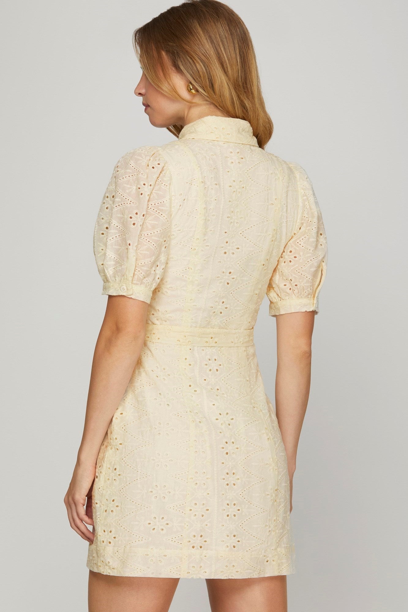 Stay cool and stylish in our Eyelet Button Down Mini Dress. Made with soft, breathable fabric and embellished with intricate eyelet details, this dress is perfect for any occasion. The button down design adds a touch of sophistication, making it a versatile and timeless addition to your wardrobe.