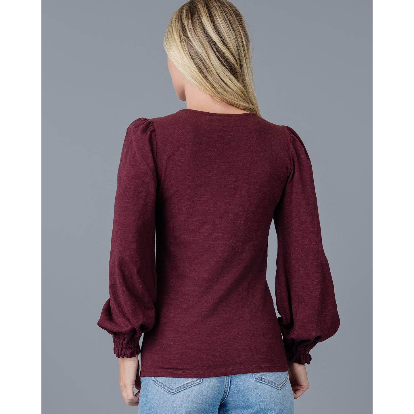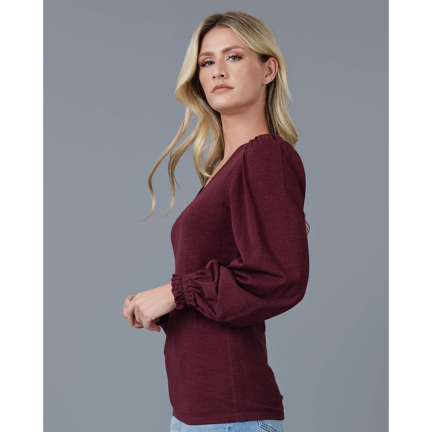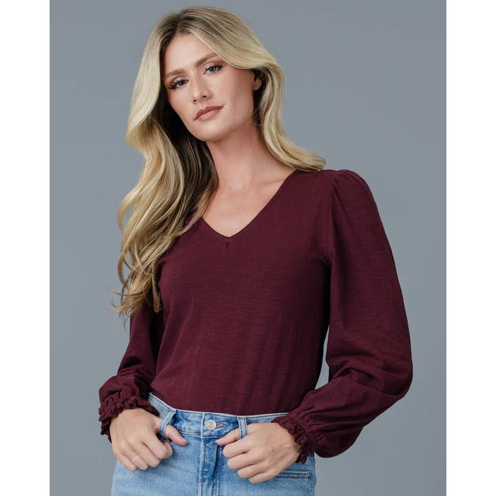 Step out in style with our Favorite Femme Top. This deep red top features balloon sleeves, a flattering v-neck, and gathered wrists for a chic, feminine look. Made with a comfortable cotton-spandex blend, you'll feel confident and fabulous all day long.