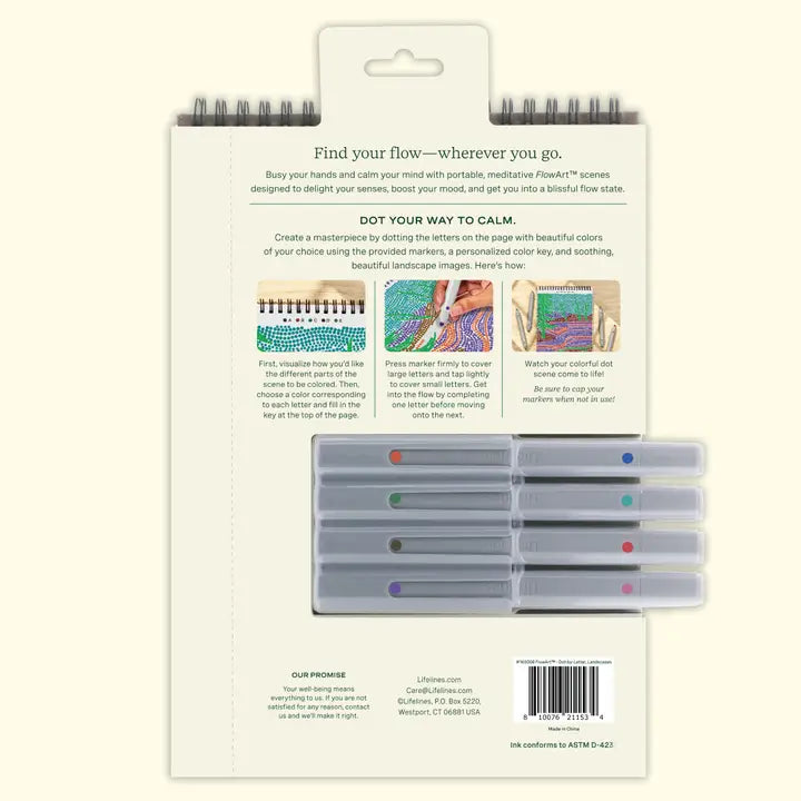 Lifelines FlowArt Pads are guided art meditations designed to help you achieve a calming flow state. Each scene is thoughtfully crafted to encourage repetitive, relaxing movements, promoting mindfulness and reducing stress. Dot-by-Letter includes 20 meditative scenes and four double-sided markers in a detachable storage tray. Engage in a meditative dotting activity using a guided letter key to fill the page with vibrant dots, creating beautiful scenes. Simply match the colors to the letters, and let the rhythmic motion of dotting bring you a sense of calm. Compact and portable, this pad is perfect for calming your mind on-the-go, unwinding before bed, or taking a work or study break to de-stress.