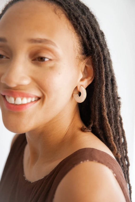 Natural or polished? Organic or refined? Choose all of the above with our Fusion Hoops. These neutral flat hoops are a midi size that is so easy to wear, in a creamy hue that pairs well with everything. Smooth water buffalo horn is studded with a delicate 14k gold plated chain, bringing the best of two worlds together.