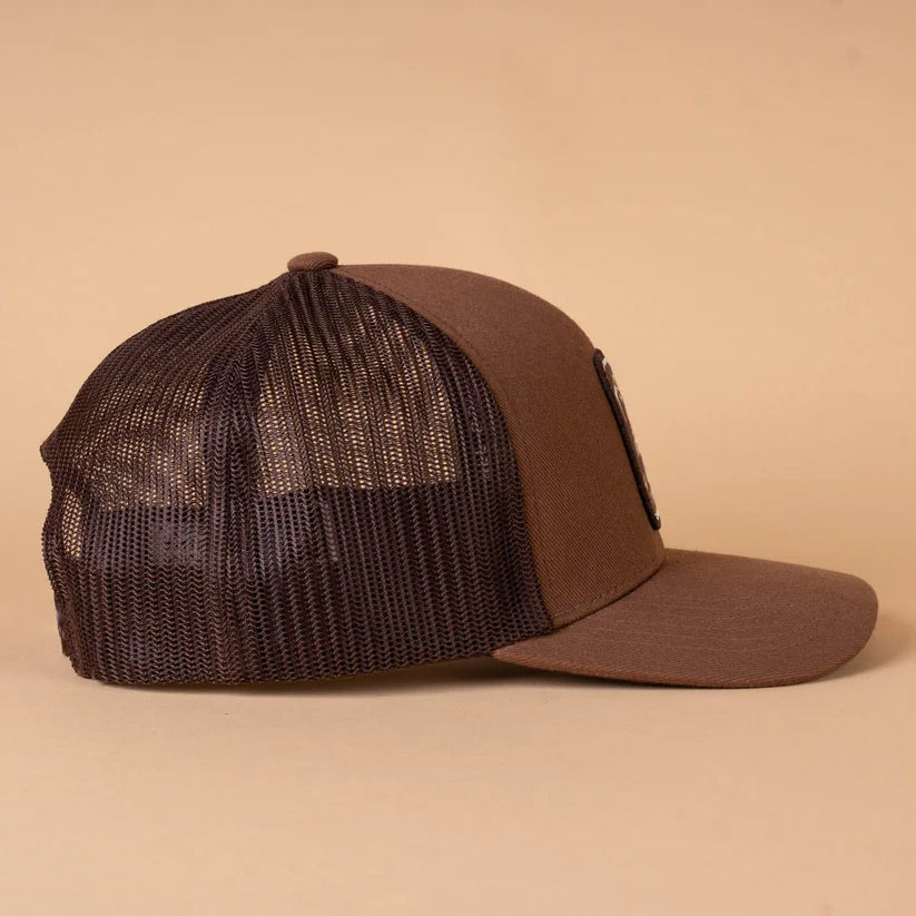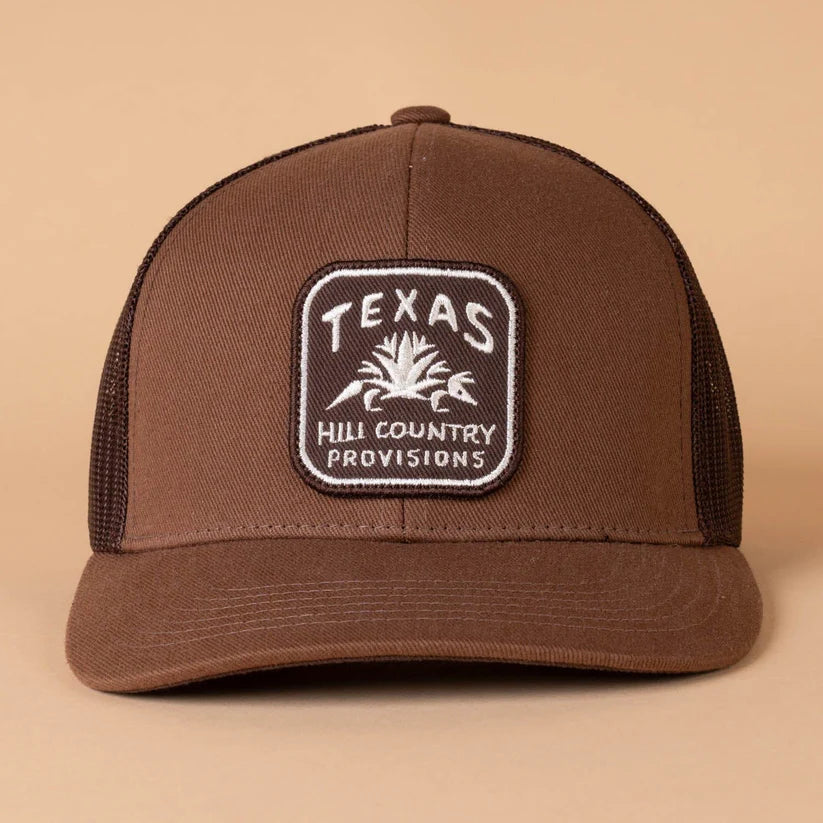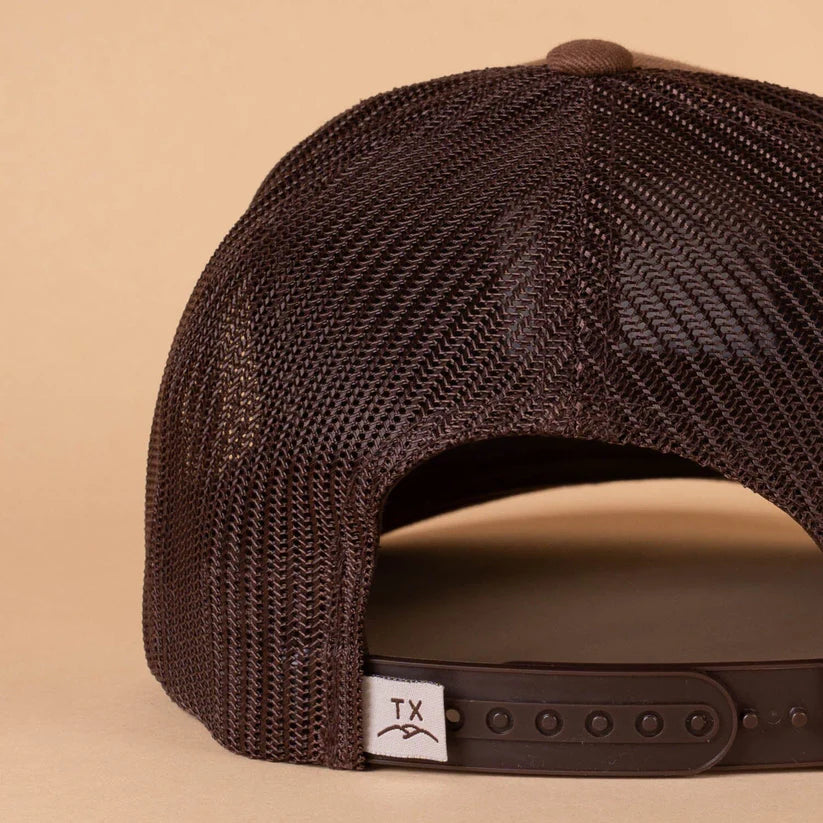Toasted pecan color, wide rib twill fabric, and hard buckram structure.