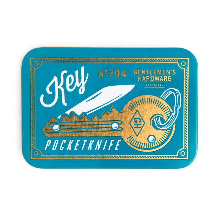 Key-shaped 2.5” Pocket Knife to add to your keys. Packaged in an illustrated tin.