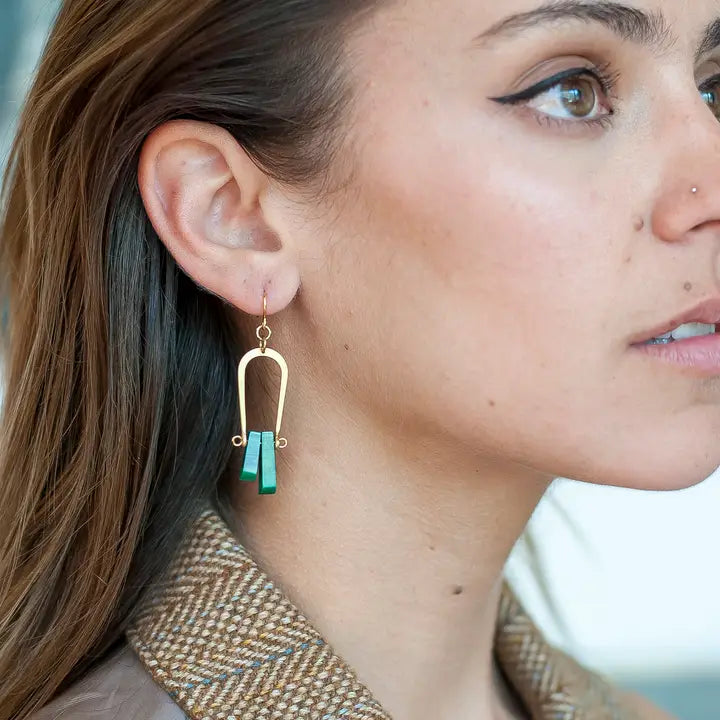 Vintage brass curved findings with two Malachite beads. 1/2" x 1 3/4". 14kt gold filled earhooks.