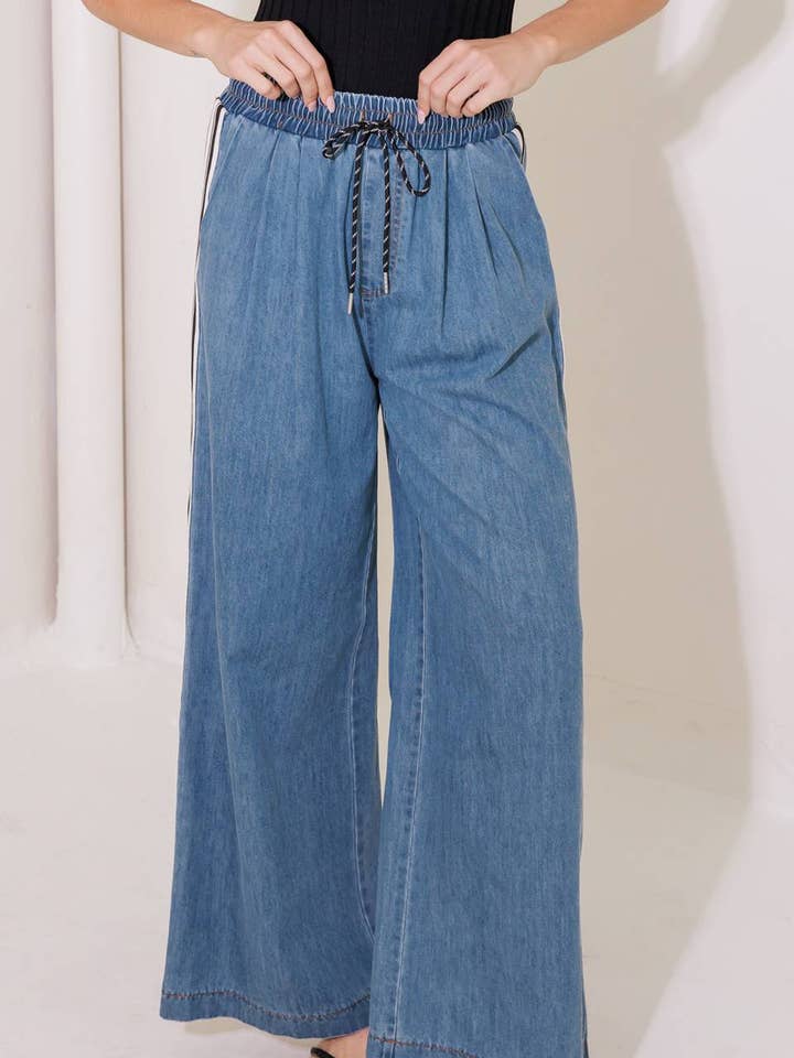 A washed denim pant featuring elasticized waist with front tie, side pocket, side stipe tape detail and wide leg Details: Self : 100% Cotton Size & Fit - Model is 5`8" And Wearing Size Small - Measurements Taken From Size Small - Approx. Length: 43"