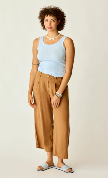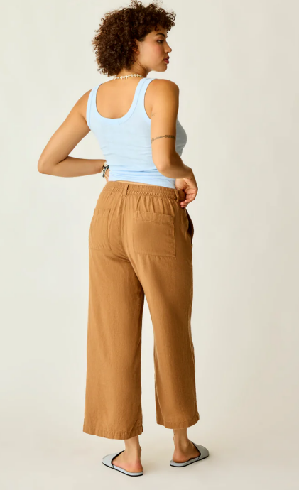 Like a summer breeze the Suki flows and goes where the spirit moves her. Embrace her front waist pleats, flat front waistband with elastic cord and raw hem. This pant is a thin linen, meant to be slightly see through to your swimsuit, radiating that beach to bar look we all strive for.