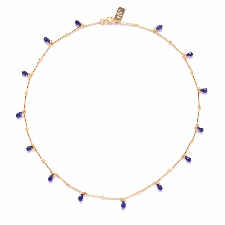Gold plated brass bar chain Vintage glass teardrops in cobalt Available in 16", 18", and 20" lengths Pictured in 16" length on model