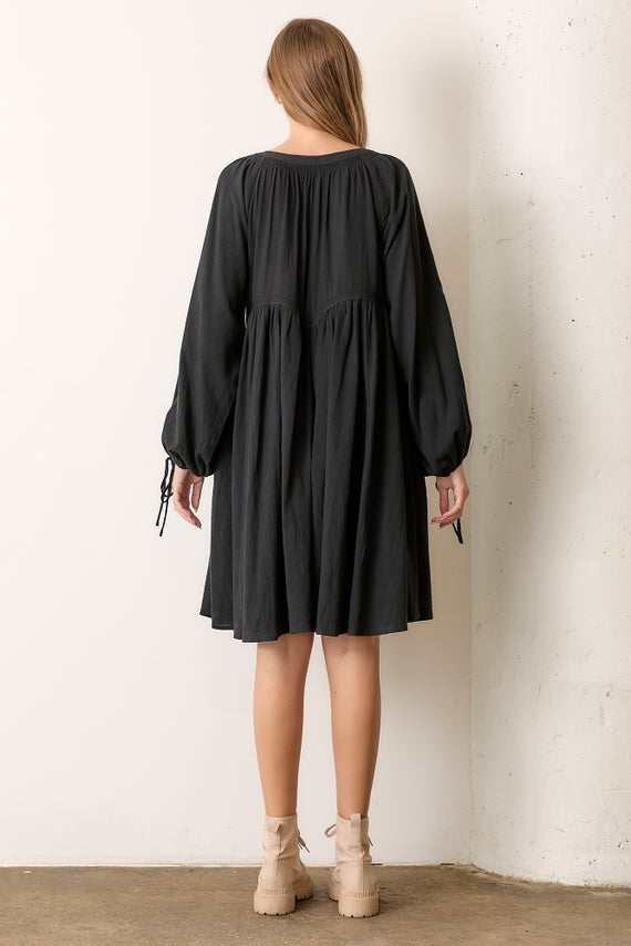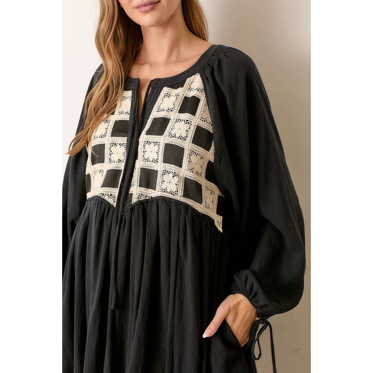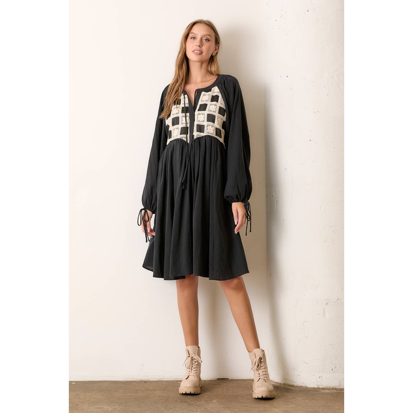 Textured Checker Pattern Dress made with a woven checkered bodice and a flattering babydoll shape, this black knee length dress will keep you stylish and comfortable all day long. With added pockets for convenience and a tie at the neck and sleeves, this dress is both practical and stylish. Upgrade your wardrobe today!