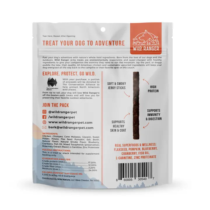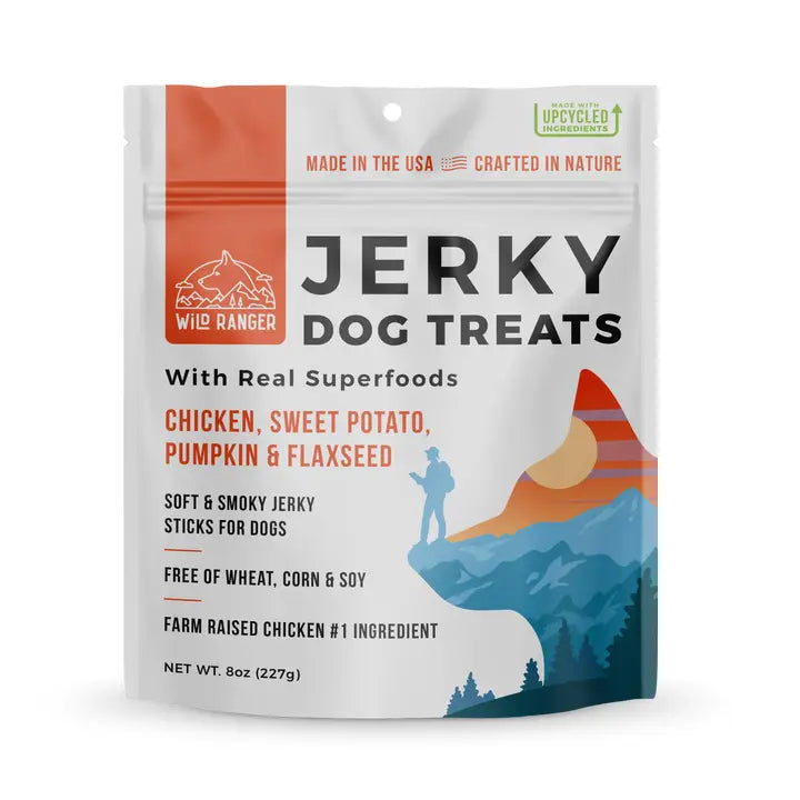 Fuel your dog’s adventure with nature’s whole food ingredients. Born from the love of our dogs and the outdoors, Wild Ranger jerky treats are environmentally responsible and super-charged with healthy ingredients to give your companion the stamina they need to run the mountain, lap the yard, or doggy paddle the lake. DOG LOVED INGREDIENTS - Wild Ranger chicken jerky is free from wheat, corn and soy to be allergy friendly and features a soft, smoky aroma that dog’s go wild for. REAL MEAT AND SUPERFOODS - High-quality, farm-raised USDA chicken is always the first ingredient in our chicken dog treats to keep your dog energized and healthy. Real superfoods like sweet potato, pumpkin, flaxseed, and blueberries along with wellness supplements like omega 3 fish oil and zinc supports your dog’s immune system, digestion, and a healthy skin and coat. MADE IN THE USA – Formulated by a leading animal nutritionists, Wild Ranger is made in a top manufacturing facility in the USA.